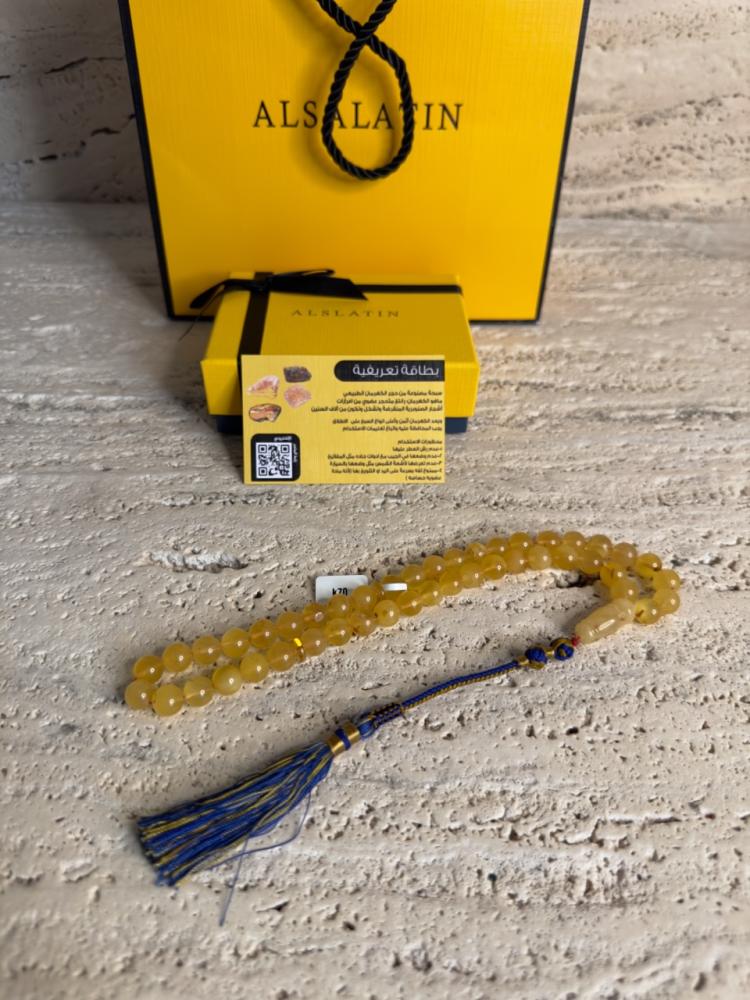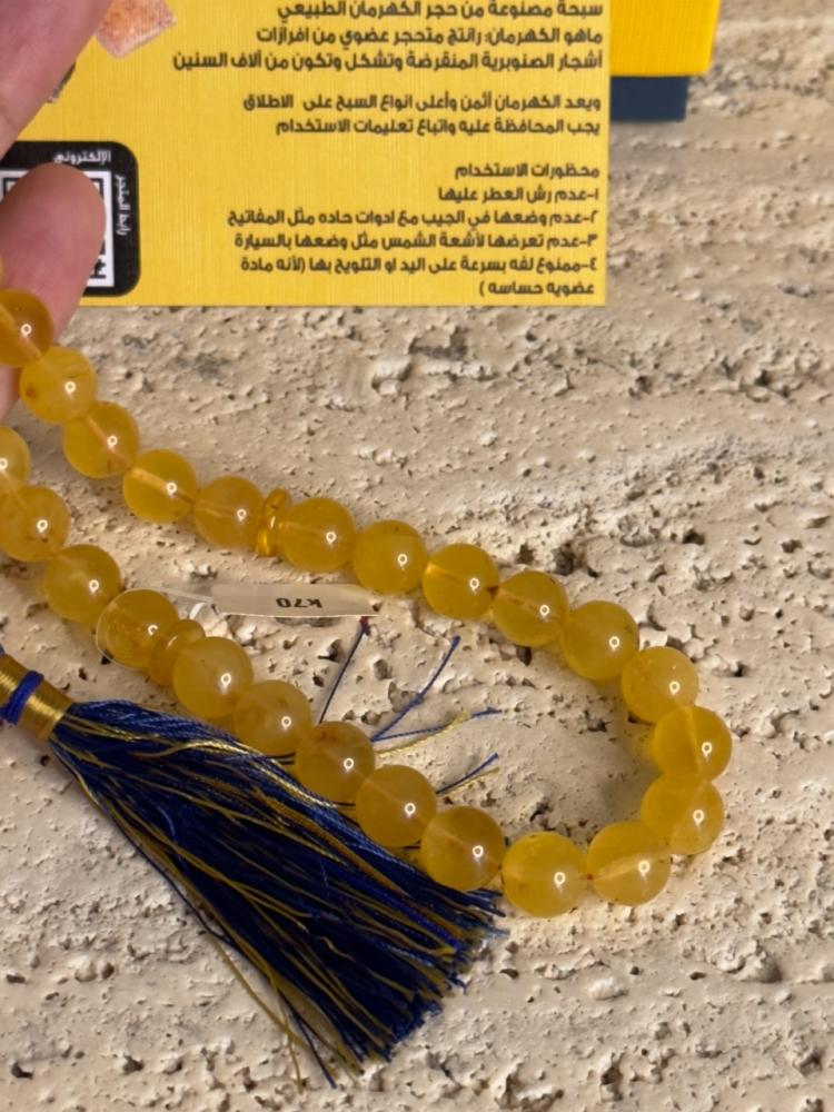الكهرمان حجر عضوي ومن ميزته انه يكون خفيف الوزن واخف من اي سبحة ممكن تشوفه وصوت الخرز رنان يشبه صوت القزاز