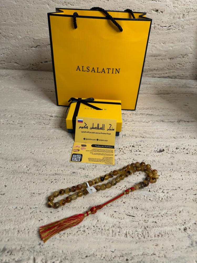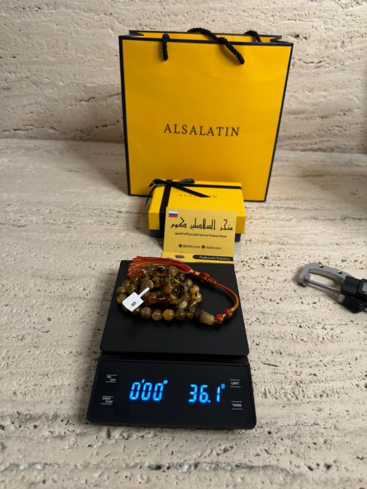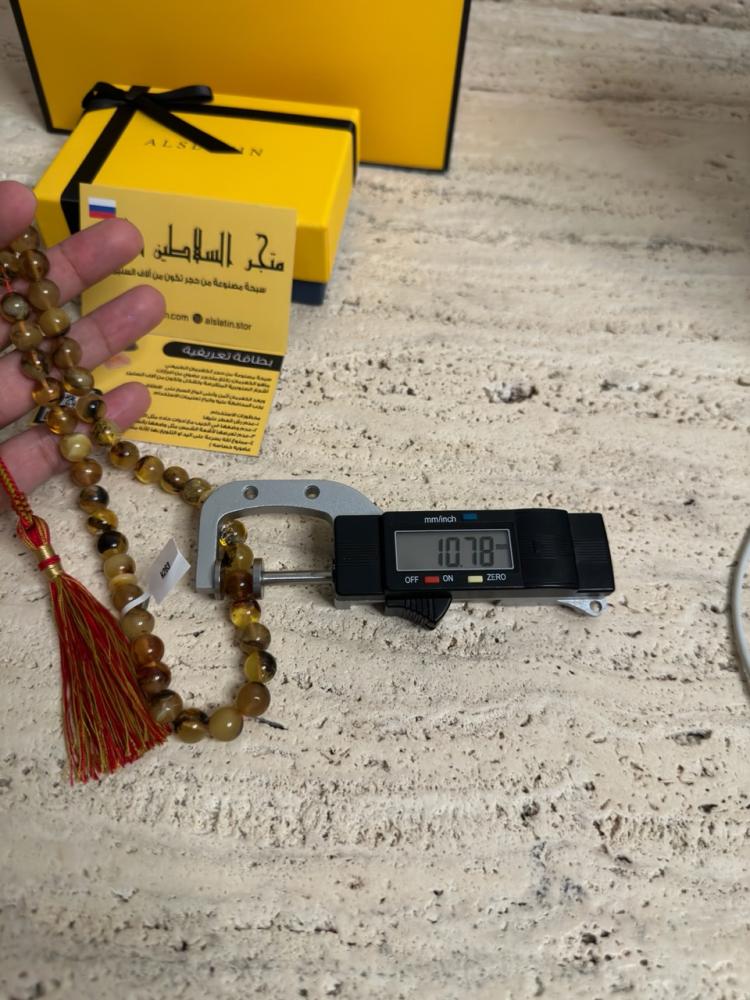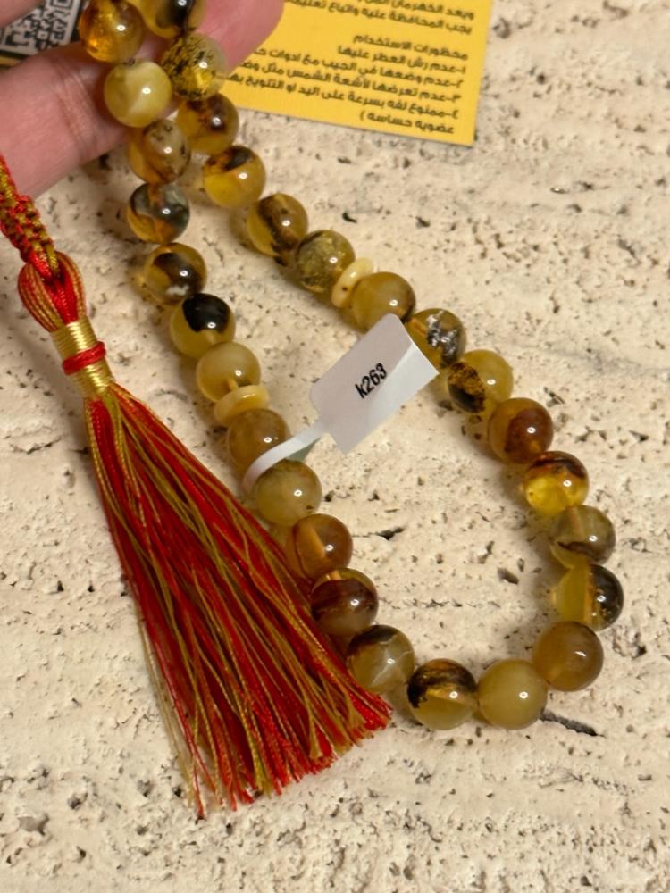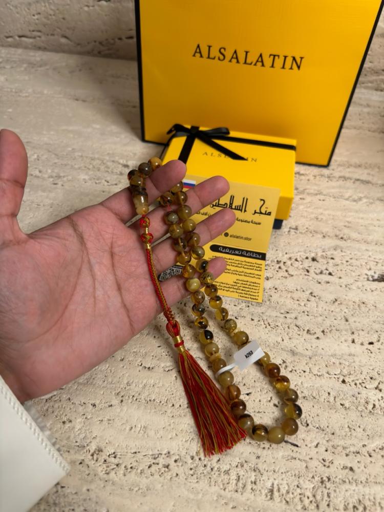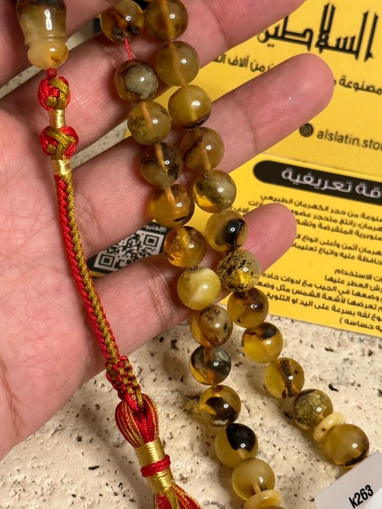 الكهرمان حجر عضوي ومن ميزته انه يكون خفيف الوزن واخف من اي سبحة ممكن تشوفه وصوت الخرز رنان يشبه صوت القزاز